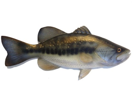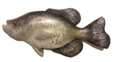 This beauty is 16" long. Carved from pine, with a glass eye and small hanger attached to the back. Painted with acrylic paint. Then given several layers of gloss sealer for protection and a smooth feel.